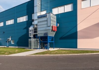 Velikost pracovního stolu obráběcího stroje dosahuje téměř 12 m. Tento prostor je zakrytovaný shrnovací plentou. Při dané velikosti pracovní kabiny a způsobu odsávání (odsávání u vřetene výrobce stroje nenabízel a nepožadoval) jsme stanovili odsávací výkon na Q = ± 30 000 m3/h. Na pravou a levou stranu pracovního stolu jsme navrhli odsávací štěrbinové digestoře. Při návrhu bylo důležité se co nejvíce přiblížit pracovnímu stolu, ale tak, aby nedošlo ke kolizi s vřetenem stroje nebo opracovávaným výrobkem.